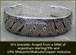 25% Shibuichi -An alloy of 25% fine silver in a copper base. Somewhat harder than 15% Shibuichi, with a somewhat lighter color. May be depletion plated to create a silvery surface. Patinated surfaces range from shades of gray to a buff color. |