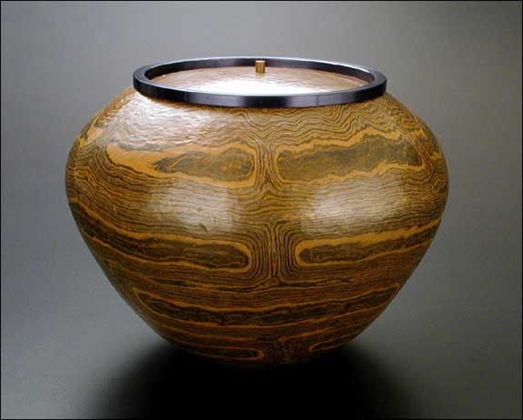 Gallery of Works The Shining Wave Metals Gallery of Works will feature a changing exhibition of artists working in various media, though with an emphasis on patterned metals. Proposals for exhibitions should be sent to artistgallery@shiningwave.com. All are encouraged to apply. Editorial and critical interference will be minimal; the viewers are encouraged to reflect on the sincere efforts of the artists appearing here. This Month's Artist: Marv Jensen of North Carolina Marv Jensen was a member of the original SIU Mokume Research Group. Much of his work is high tech/furturistic including electric music instrument design, medical equipment and motorcycles. His holloware represents an interest in pursuing a historic craft within the context of his own aesthetic. The holloware works are infrequent but consistent and have been made for the last 25 years. Marv Jensen lives and works in the mountains of western North Carolina Marv Jensen may be contacted at: mjkg@main.nc.us. Title: Vessel The mokume-gane for this work was made by Shining Wave Metals as a special order. It was supplied in the form of a flat grain slab approximately 1/2" thick. |